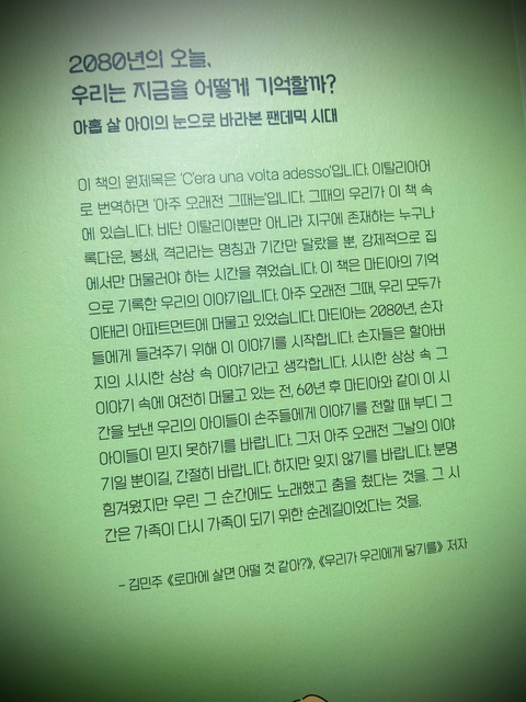 이 책은 9살 마티아의 시선으로 본 코로나 팬데믹 상황을 묘사하고 있는 동화같은 이야기입니다.